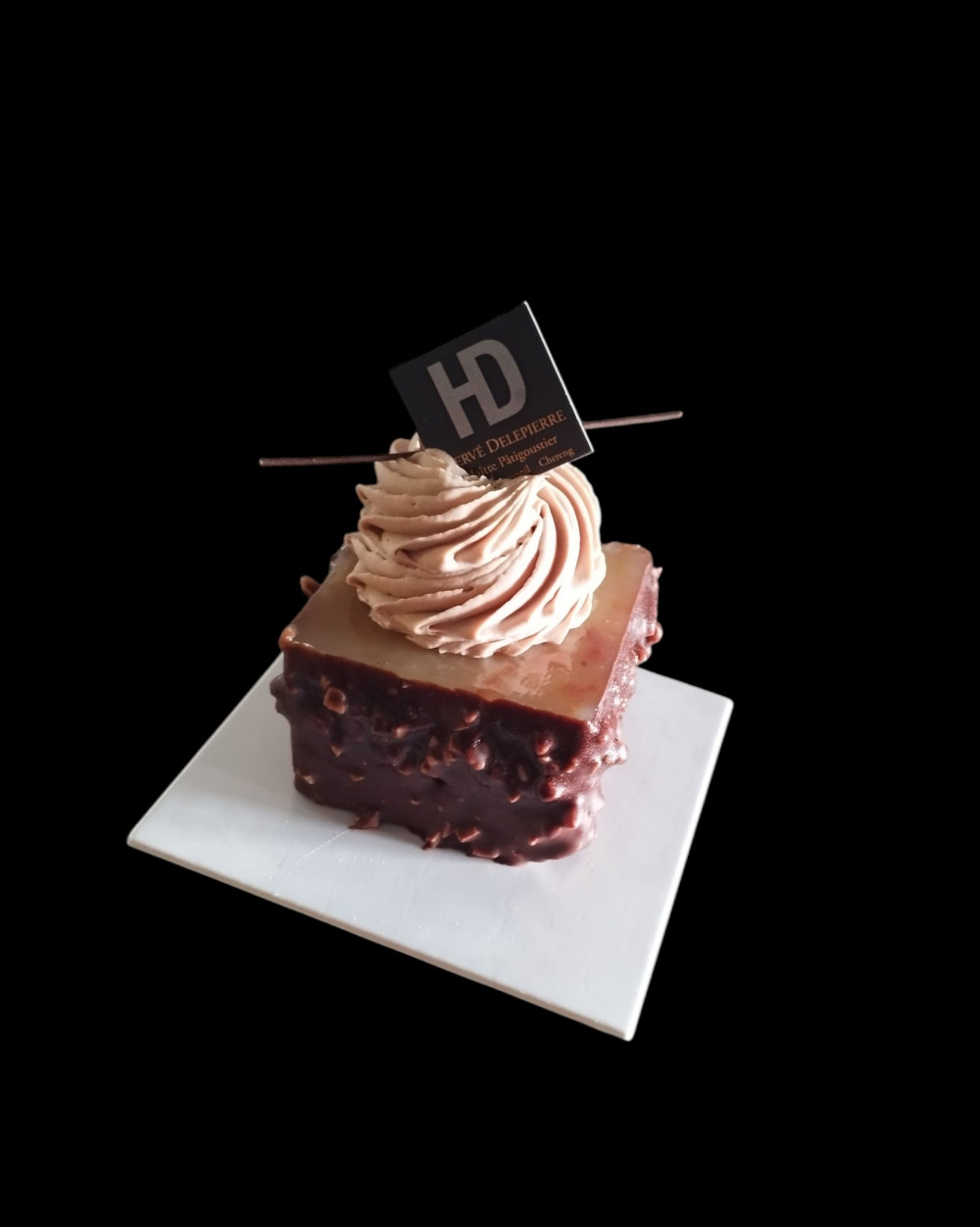 Brownie, crémeux chocolat, confit de banane à la vanille et rhum, gaache montée lactée