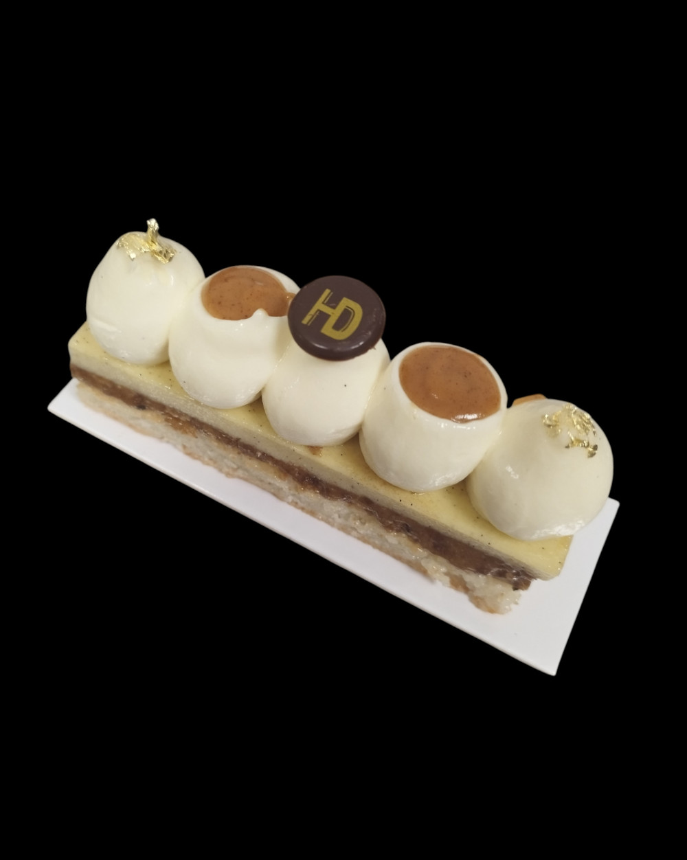 Crémeux vanille, ganache montée vanille, streusel praliné vanille, dacquoise aux amandes.