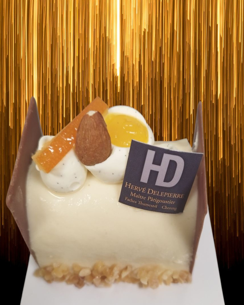 Pain de gênes vanillée aux amandes, mousse au lait d'amandes, garniture calisson, marmelade d'agrumes vanille.