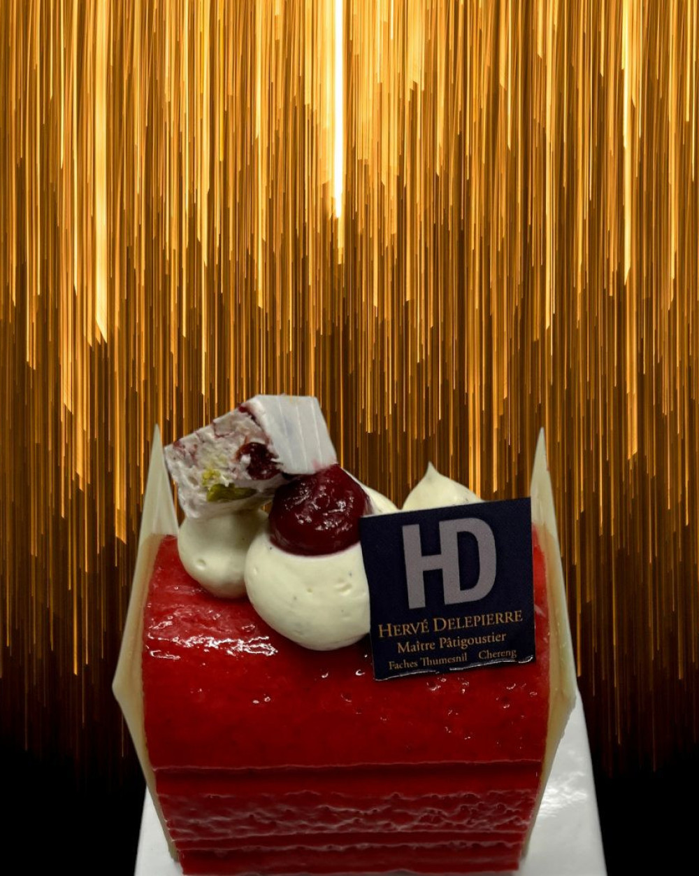 Mousse framboise et crémeux au nougat, croustillant fondant et biscuit pâte à choux dragéifié